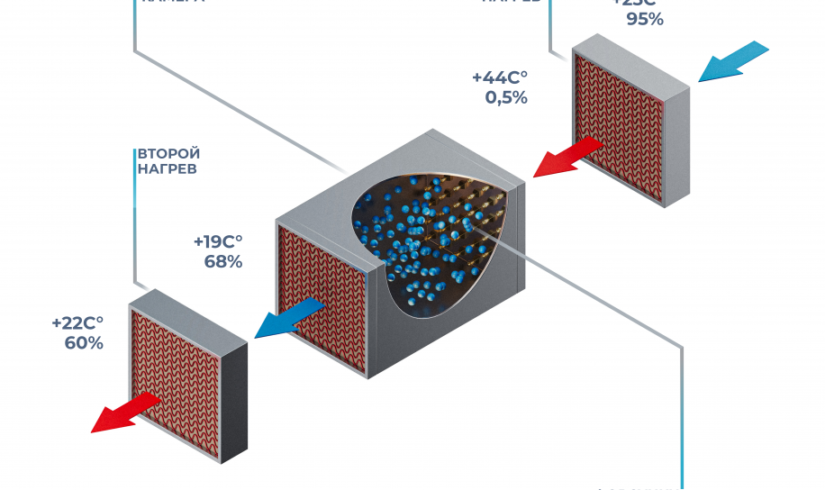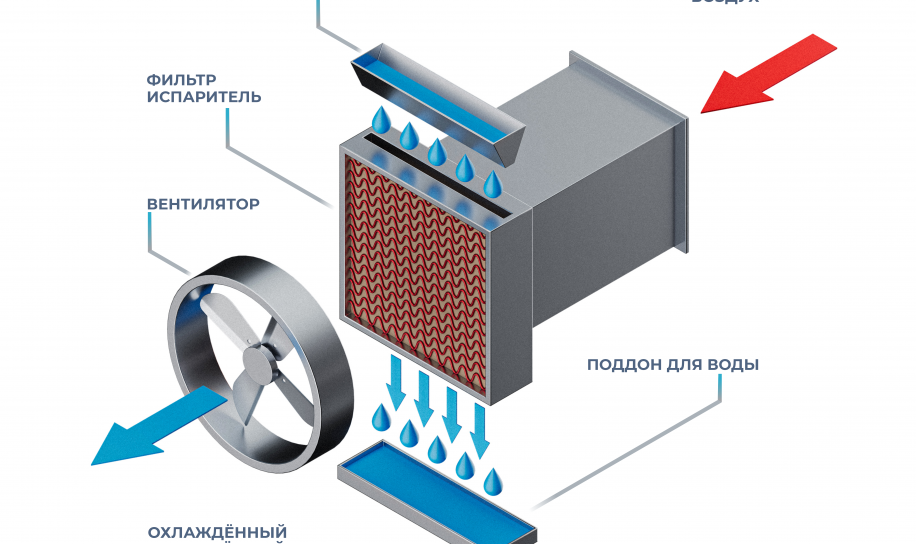 Эти устройства работают по принципу испарения воды без дополнительного нагрева, что делает их энергоэффективными. Воздух проходит через увлажненный картридж, и благодаря этому, он увлажняется и охлаждается. Такие устройства без особых проблем монтируются в существующие каналы вентиляции и управляются автоматикой.